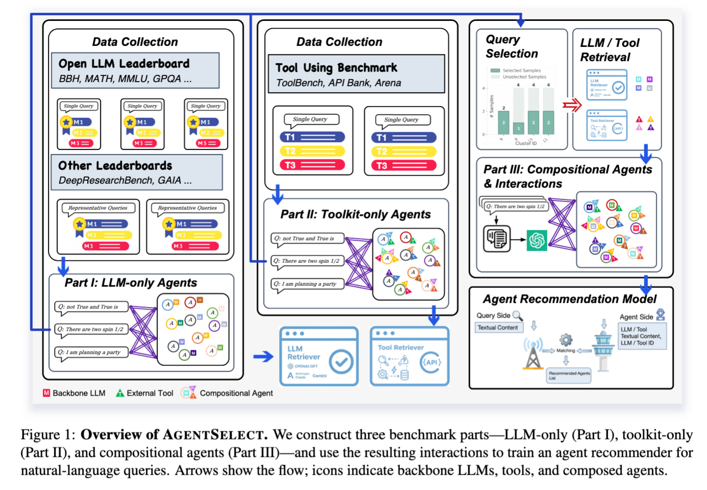 Figure 1: Overview of AgentSelect. Arrows show the flow; icons indicate backbone LLMs, tools, and composed agents.